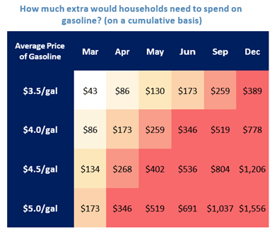 As shown in the table below, the cumulative impact of higher gasoline prices on a typical household wouldn’t reach $1,000 even if gasoline were to stay at $4 per gallon through the end of the year. That said, lower-income households are feeling the pinch given that they spend a higher share of income on fuel and other necessities. Higher income households, which account for a disproportionate share of consumer spending, are less sensitive to what happens at the pump.